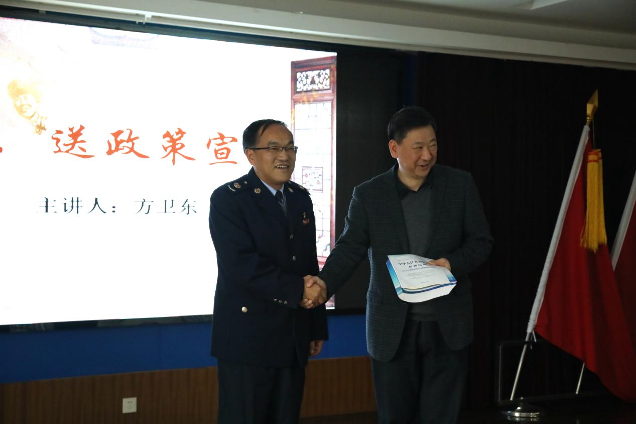 活动分唱歌曲、送政策宣讲、学模范、谈感悟、诵经典、习礼仪、知识竞答、送吉祥等八个环节。活动在全员诵唱“三德歌”的歌声中拉开帷幕。“四送一服”—送政策宣讲环节,繁昌区税务局局长徐宏权为繁昌农商行董事长章杰送去税收政策汇编,税政股方卫东同志为大家宣讲了金融企业所得税政策。
