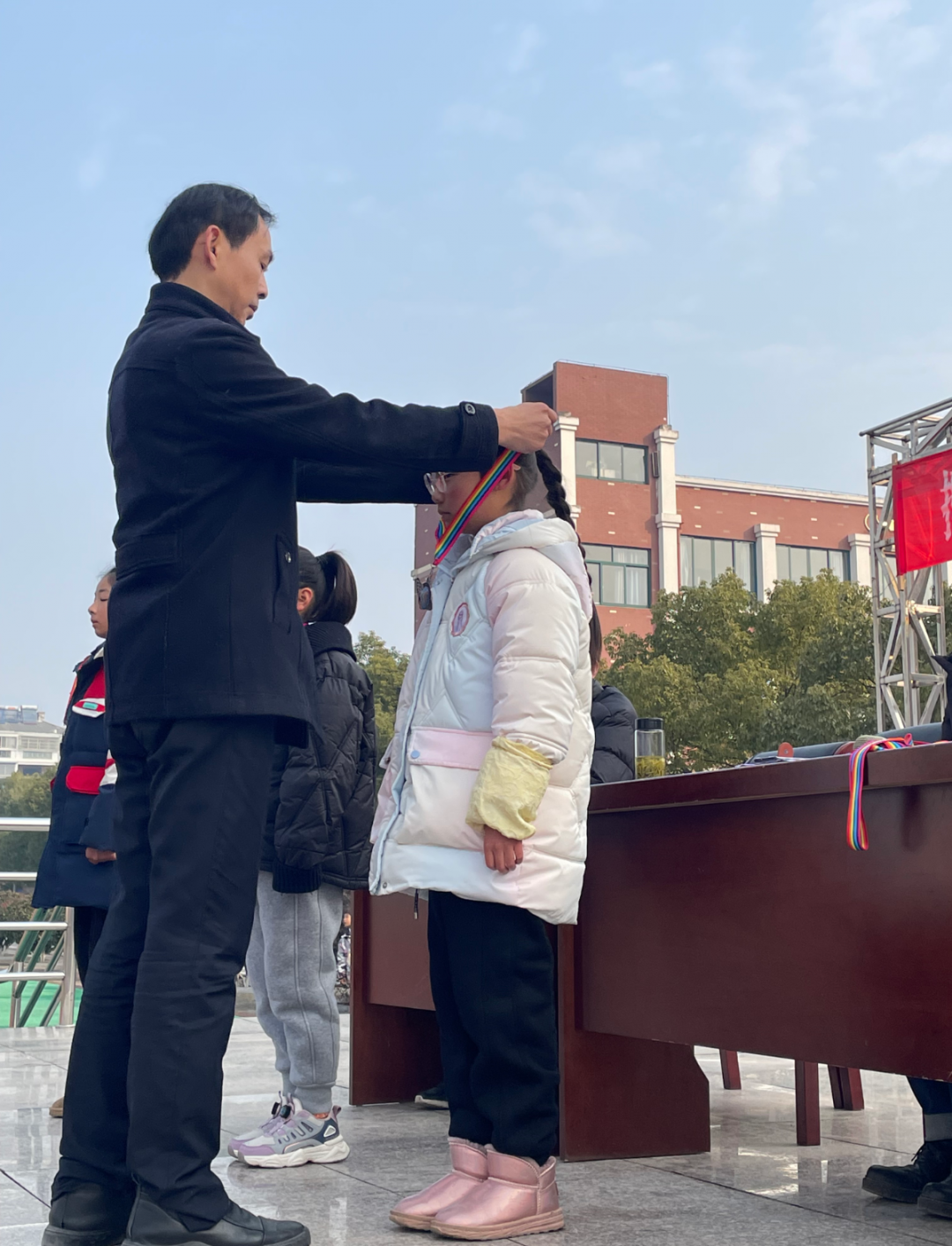 大会第三、四项,周意林副校长宣布铜质奖章获得者名单,同时鼓励全校学生不断努力,争取进步。颁奖仪式隆重进行。学校领导们为获奖同学一一挂上奖章,沉甸甸的奖章是孩子们刻苦努力的印记,满脸的笑容洋溢着自信和骄傲。孩子们学习目标更加明确,优秀成绩在发挥着榜样的力量。